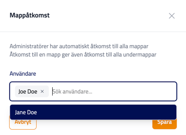 Öppna mappens menyfält och klicka på Dela för att öppna delningsinställningarna, och välj sedan vilka Användare som ska ha tillgång till mappen och dess innehåll. Endast Användare listas då Ägare och Administratörer redan har full åtkomst till alla mappar.